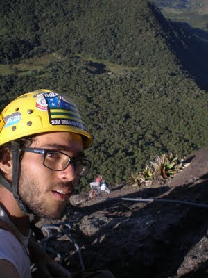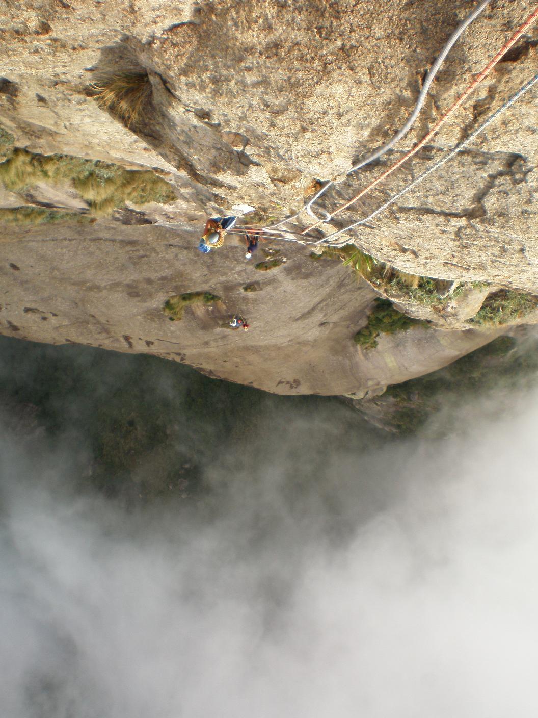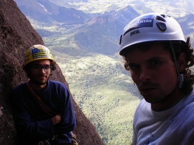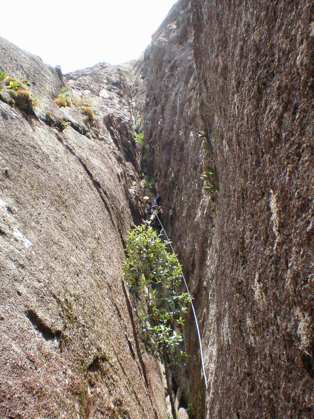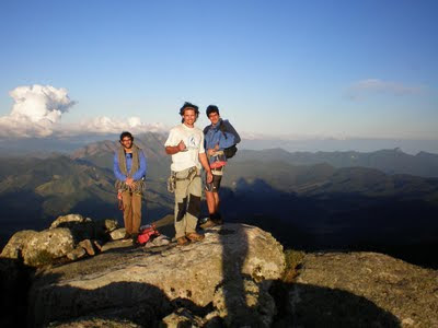 No dia 22 às 6h30 começamos a subir a trilha pra Leste com o Fred e o Ílson. 8h começamos a escalada que é graduada em D4 5° V (A0/6sup) E3 700m. A outra dupla foi na frente, sendo que o Fred já conhecia a via, o que nos poupou o tempo e o perrengue de ficar procurando os grampos e o traçado correto da via. A escalada foi relativamente tranquila, seguimos a estratégia de escalar à francesa até o Platô do L, na oitava enfiada, parando somente uma vez pra trocarmos as costuras e a ponta da corda. Eu guiei a primeira chaminé e o Zé a enfiada seguinte, uma das mais delicadas da via, continuamos à francesa até a base da segunda chaminé, mais longa e cansativa que a primeira. Esperamos na P12 um trio de escaladores que passaram voando por nós, fazendo a via inteira a francesa, era o Neto, Daniel e Bernardo, do Rio…Passamos o prmeiro artificial e tocamos a francesa até o cume, onde chegamos às 15h. Passamos mais de 1h lá em cima, curtindo o visual no meio das nuvens e descemos pela “Cidade dos Ventos”, também não tivemos que procurar a via de descida pois o Fred facilitou nossa vida novamente mostrando o caminho pro chão!