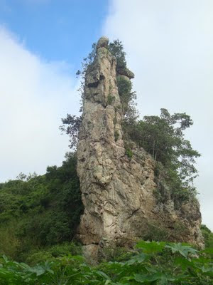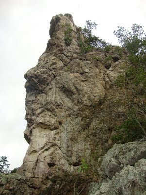 Trata-se de uma falésia com até 50m e duas agulhinhas um pouco menores, a estrada passa bem pertinho da base da falésia, mas continuamos seguindo para fazer o reconhecimento, chegando de cara pra agulhinha, a qual escolhemos como o objetivo do dia.