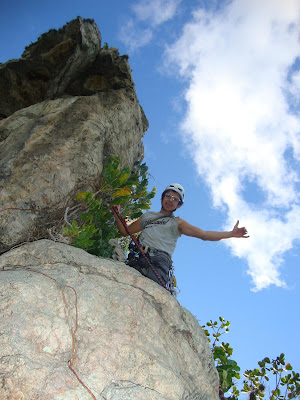 Comecei a conquista e no primeiro grampo percebemos que a rocha não era das mais duras, pois o furo foi bem fácil de fazer, mas com os grampos batidos só com a broca de 12mm as proteções ficaram com boa qualidade. Nos lances seguintes a rocha ficou melhor nesse aspecto. Foi uma seqüência de cinco grampos de muuuuita chinelada nos marimbondos, algumas picadas no braço, mas deu pra sobreviver…Esse trecho ainda não foi livrado, mas deve ser algo em torno de VIIc. Depois foi um lance em móvel, chegando a um pequeno platô, onde pode ser feita uma parada opcional. Em seguida mais um trecho fixo que pode dar VIIa, depois uma fenda larga, mais um grampo, domínio em uns blocos levemente sinistros e cume!