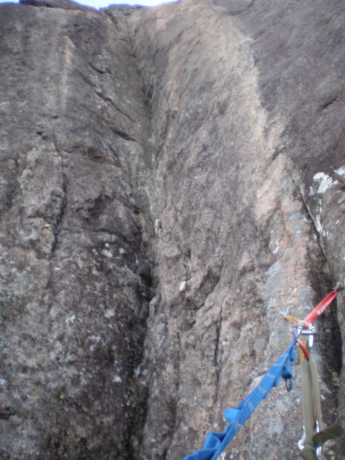 O dia seguinte ficou chuvoso, uma leve garoa caiu durante o dia todo, mas no domingo o tempo abriu (não abriu muito, mas parou de chover) e fomos pro Pontão do Pico Maior passar frio na Sol Celeste (280m) D2 5° V+ E3, a via tinha sido recomendada, mas eu não imaginei que seria tão louca! São duas enfiadas de aderência e depois a parede fica bastante vertical com agarrões gigantes e as proteções bem espaçadas, fixas e móveis, sem dúvida esta pode ser dita uma via “bastante aérea”, pra fechar a trip com chave de outro!