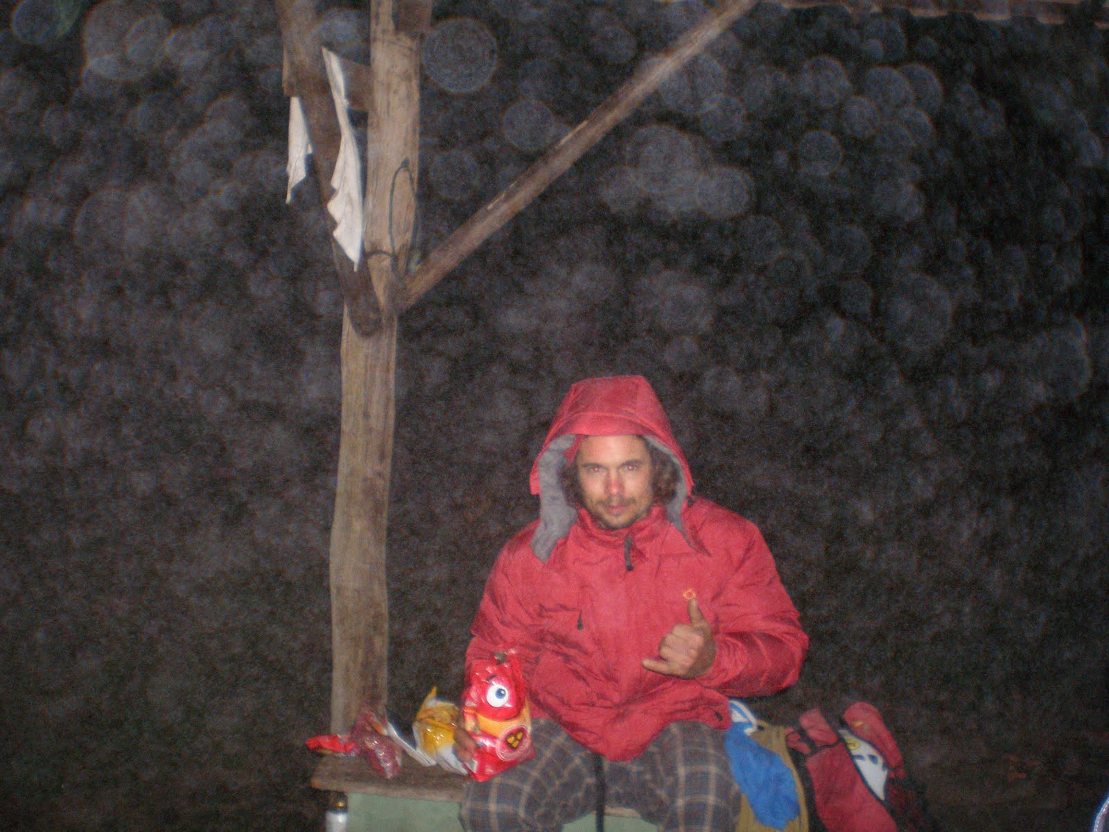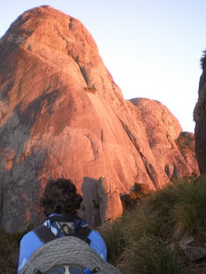 Foram 9h de escalada, mas o dia não iria acabar tão cedo…hehehe. Descemos os costões para rapelar pela via Cidade dos Ventos (não é a via mais utilizada pro rapel, mas a única que conhecíamos então resolvemos utilizá-la) no segundo rapel, ainda de dia não encontramos de maneira alguma os grampos do próximo rapel, a noite caiu e tivemos que improvisar pra evitar uma noite fria na parede. Encontramos uma boa laca para laçar e fazer o rapel, se os nossos cálculos estivessem certos, ao rapelarmos da laca, chegaríamos à Cidade dos Ventos novamente, o Zé desceu testando a laca com o backup de dois friends equalizados, chegou a um platô de mato 55m abaixo, em seguida eu removi os friends e desci na laca devidamente testada e aprovada. Achamos os grampos abaixo do platô, fizemos o mais dois rapéis de cordas emendadas e BINGO! a corda prendeu na hora de puxar! Felizmente conseguimos liberar o nó e ficamos com 1 corda ainda, por sorte a partir dali, só dali, os rapéis eram possíveis com apenas uma corda de 60m…ufa! Chegamos no camping 21h30, cansados e felizes por podermos dormir no conforto de nossas barracas naquela noite! Uma das cordas ficou na parede e foi resgatada pelo Pedro e pelo Tácio alguns dias depois., rapelando pela via.