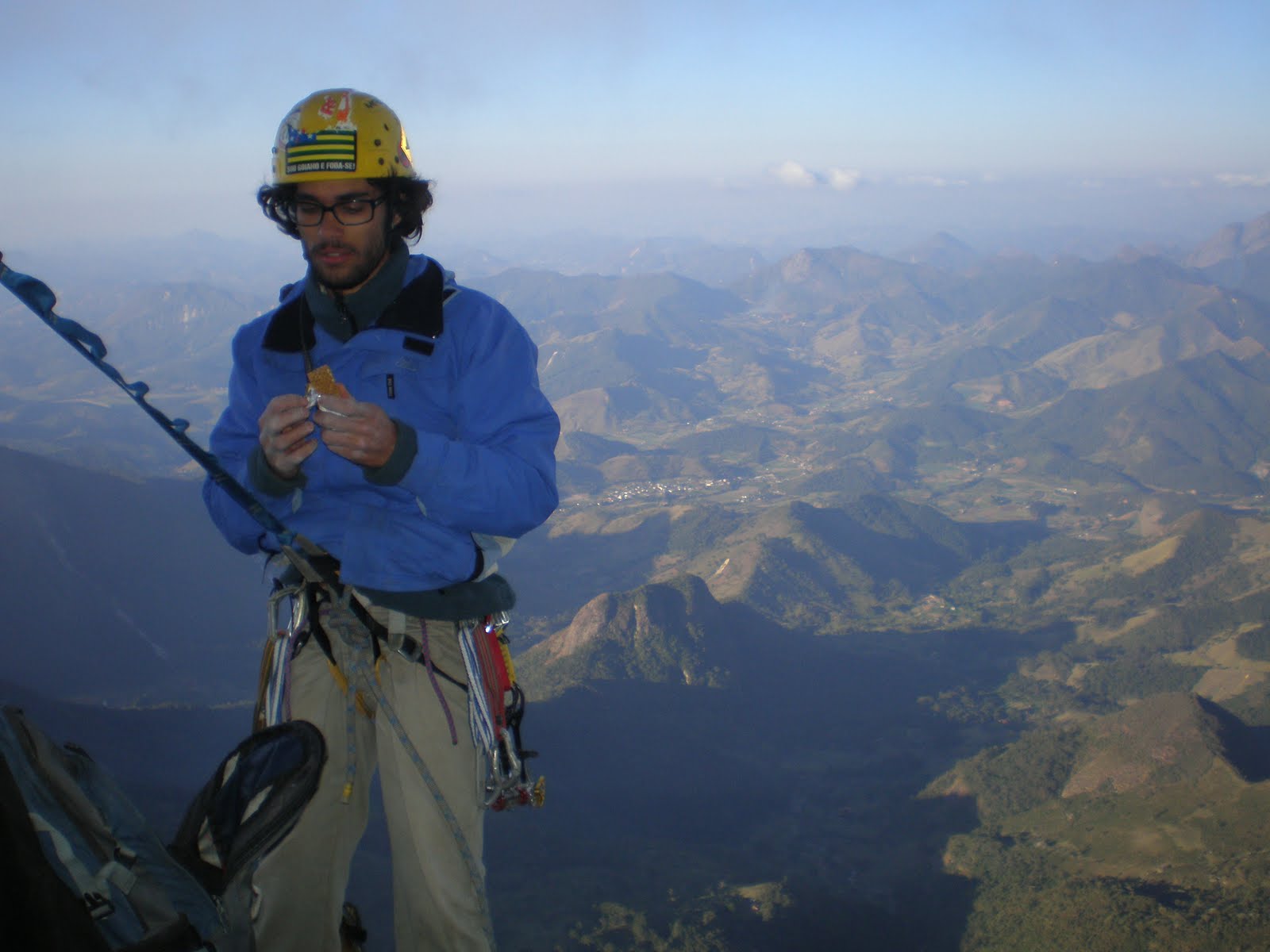 No outro dia escalamos a Fata Morgana D3 5° V+ E3, no Capacete, a via em si possui 280m, mas inicia na P1 da CERJ e termina antes das duas últimas enfiadas da mesma, totalizando cerca de 400m de escalada. A via é linda, segue um traçado natural e possui bons lances em móvel, porém sem muitas fendas definidas, exigindo um pouco da criatividade do escalador pra proteger os lances. Quando chegamos ao cume vimos uma dupla chegando ao cume do maior, e coincidentemente eles iam rapelar pela via em que nossa corda estava presa, alguns gritos pra lá e pra cá e pronto, corda recuperada! Depois soubemos que os escaladores eram o Pedro e o Tácio, e que tinham feito a Arco da Velha e estavam em um rítmo frenético em Salinas!