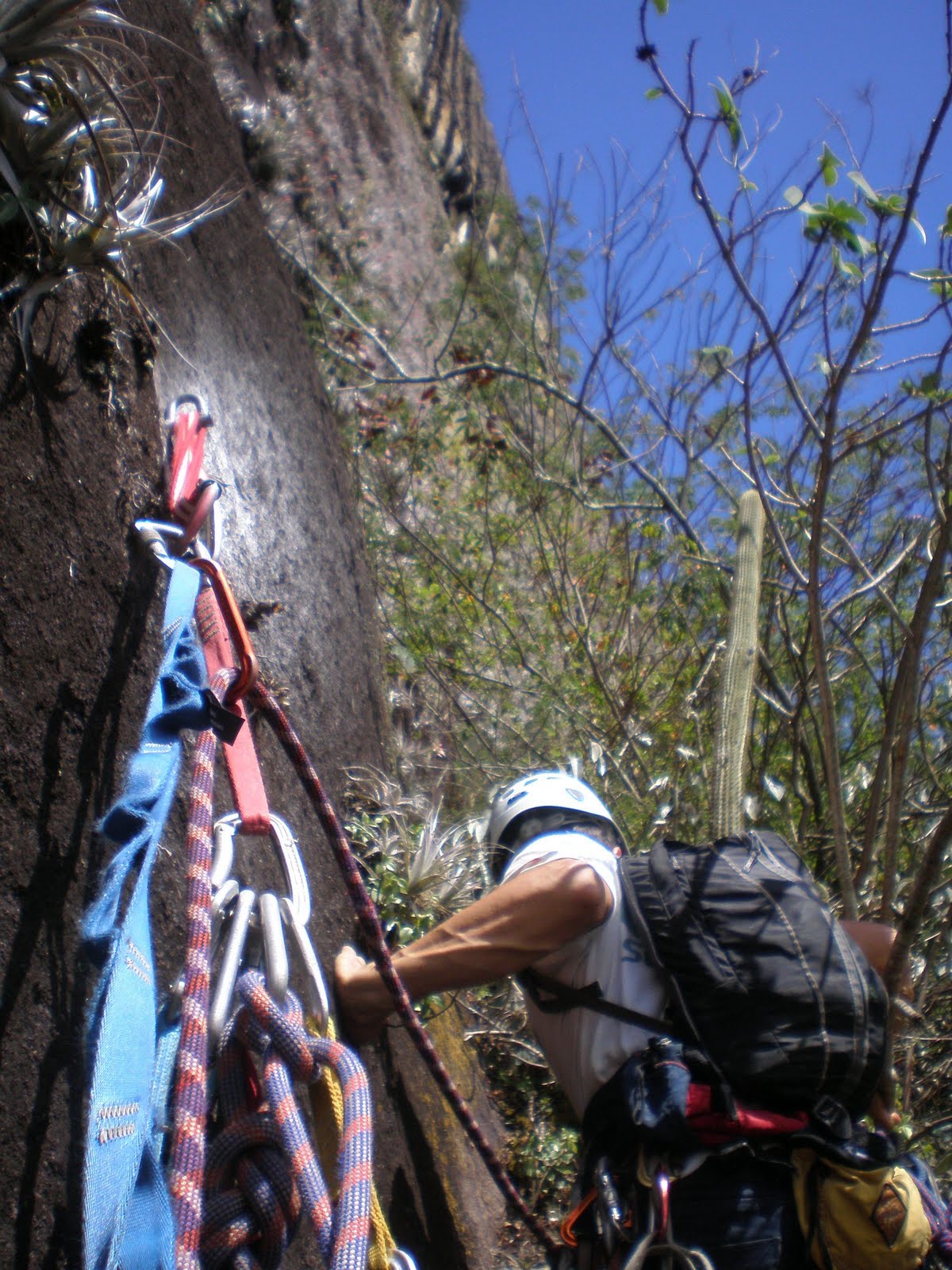 Segunda-feira jumareamos, terminamos a fenda, na verdade fugimos pra uma linha de agarras ao lado dela, chegando a um platô de mato menor, puxamos o Raul e conquistei o segundo trecho em A2, chegando a um platô, antes do headwall. Bati a parada chamei o Luciano e já sabíamos que não iria dar tempo de sair por cima, pois já era tarde e tinha mais uns 40m de conquista até o cume com graduação na casa do sétimo possivelmente. Mesmo assim o Luciano bateu mais dois grampos, foi quando começou a chover, nos apressamos em descer com a dúvida de deixar ou não cordas fixas pra próxima empreitada. Como não tinhamos data prevista e teríamos que voltar pra Recife no dia seguinte, descemos com tudo. Eis que no penúltimo rapel uma das cordas prendeu…continuamos a descida e deixamos a corda do ultimo rapela passada nos grampos pra no dia seguinte irmos buscá-las.