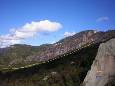 Quando começamos a pensar nessa conquista, visualisamos uma linha sem vegetação, na qual se chegava ao cume da montanha escalando, portanto, a caminhada seria mais longa, pois a base é mais elevada. A primeira parte era positiva e a segunda bem vertical e possivelmente sem agarras, o que forçaria trechos em artificial fixo, depois visualisamos um diedro quase na linha pretendida, resolvemos passar por ele, o que deixou a conquista mais bacana!