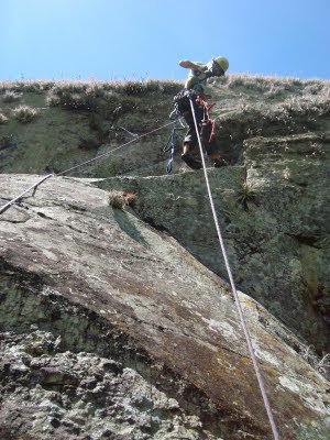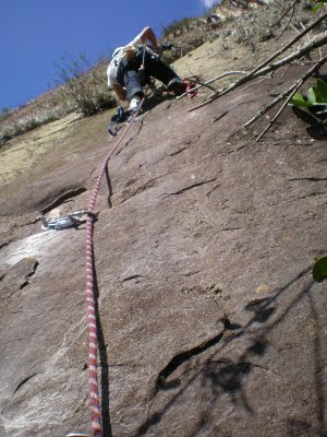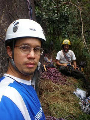 A quinta-feira amanhaceu chuvosa também, mas não durou muito e começamos a jumarear às 8h. Nesse dia guiei um diedrinho em móvel meio sujo, terminando por um positivo também com musgos chegando ao grande platô de mato no meio da parede, antes dela ficar mais vertical. O Luciano deu início ao trecho em artificial fixo, alternando grampos e parafusos. Descemos ainda de dia para fazer o início da trilha de volta com luz e devagar por causa do pé doente, agora só estávamos nós dois e é fácil de se perder por lá.