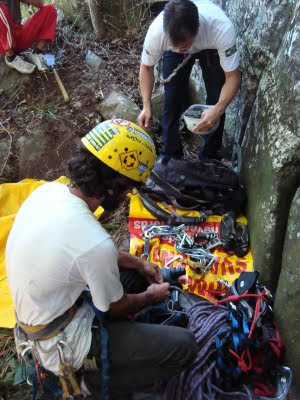 No dia seguinte, pra variar o Luciano ficou choramingando por causa do pé, resolvi aproveitar que o tempo estava bom e subi sozinho pra buscar os equipos que faltaram. Consegui desprender a corda e descer com tudo. FIM