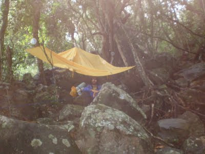 Saimos na quarta antes das 5h da manhã com uma chuva fina, que não parou antes das 12h. Começamos a escalar às 14h após a pedra secar, tocamos mais uns 50m de IV ou V grau e descemos pra base, deixando uma corda fixa. Rango feito na fogueira com a lenha úmida e capotamos.