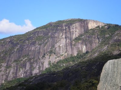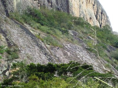Segunda-feira, dia 15 de agosto nós deixamos de analizar e rumamos pra base da parede. Com a ajuda da galera de Brejo (Silas e Zé do Ovo) eu e Luciano Willadino subimos a trilha da garganta (caminhada q leva ao cume) com todo equipo de conquista e poucos grampos, a idéia era fazer o transporte e procurar bem a melhor linha pra começarmos. Chegamos rápido ao local que queríamos, organizamos a base e começamos a conquista. Nesse dia sairam os primeiros 30m, algumas proteções móveis no início, e um lance de VIIc ou A1 e depois a via fica mais positiva, com lances de IV e muita vegetação na rocha (Tilanzias). Finalizamos o dia assim, terminando de subir a trilha pro cume, de onde voltamos pra Brejo em uma caminhada de cerca de 2h.