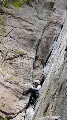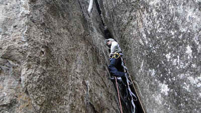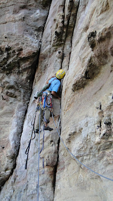 Descemos da Jararaca e continuamos na trilha até o próximo diedro, não sei qual dos dois é mais bonito, e agora era minha vez =D. Comecei tirando um pouco de terra das fendinhas pra proteger e logo foram aparecendo ótimas agarras, saí do diedro e toquei pra direita em um positivo de boas agarras, menos protegido mas bem mais fácil de escalar, bati uma parada nos 30m, antes do trecho em que a parede fica mais vertical. A segunda enfiada ficou bem curtinha, com uns 15m passando por um diedrinho de VIIa também, que custou mais caro pra passar. Mais uma via: Dente de Ouro*** (5° VIIa E3) 45m.