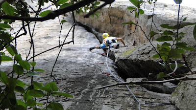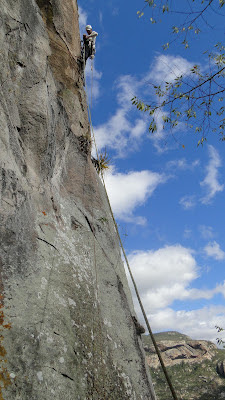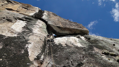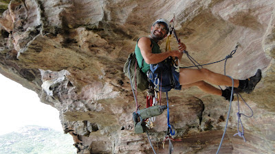 Ainda deu tempo de ir pro setor Casca Grossa, onde existem 3 vias em móvel e 1 fixa. Entrei na Lamúrias de Morcego, um 7b misto que o crux é costurar a parada, foi suado mas saiu na primeira também, diferente da Xambrisvaldo, um teórico 7a num diedro meio polido e com umas lascas dentro da fenda que atrapalham o sistema..kkk, tentei e não fu bem sucedido, passei a bola pro Otto que passou o lance, depois eu fui limpando, a via ainda não possui cadena.