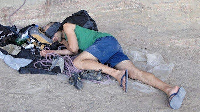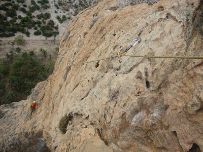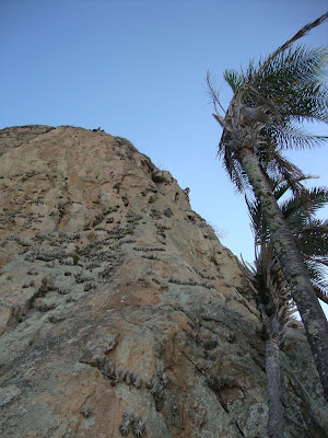 No dia seguinte fomos atrás de mais uma via pra conquistar, a parte de trás do Morro da Fonte aparentava ter uma linha de diedros do início ao fim, cerca de 60m. Não foi tão simples assim, o início era bem sujo e fraturado o que nos fez iniciar mais pelo lado, pelas agarras batendo algumas chapeletas até encontrar o diedro novamente, agora em sua parte boa, protegida por uns 3 camalots #4, como só tinha um o Otto foi arrastando ele p/ cima. A segunda enfiada foi por uma fenda um pouco suja e cracolenta depois uma horizontal num tetinho com peças grandes também, essa parte foi em artificial, mas deve rolar de livrar depois, mas chegando no cume não queríamos mais nada a não ser descer pra sombra! Estávamos quase passando mal de tanto sol na cabeça, isso que dá conquistar ao meio dia na Bahia: Quem pode Foge (VI A1 E3 55m).