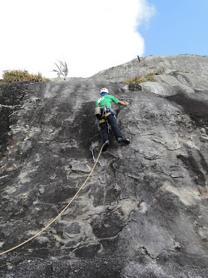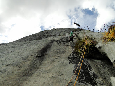 A parte mais tensa pra mim foi a saída do grampo, tem um lance longo no fator 2 por umas canaletas bem íngrimes, depois não tem onde proteger, mas a via fica bem mais positiva e dá pra escalar com mais confiaça, o local da P4 (móvel) estava um pouco pra direita e o cume estava próximo se seguisse reto, o lance era fácil e a corda era grande, lá eu fui. Parei em um bloco de pedra laçado no cume e puxei os parceiros, terminando o ano com chave de ouro!!