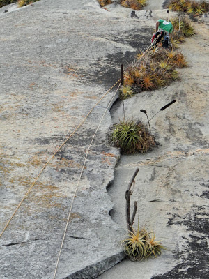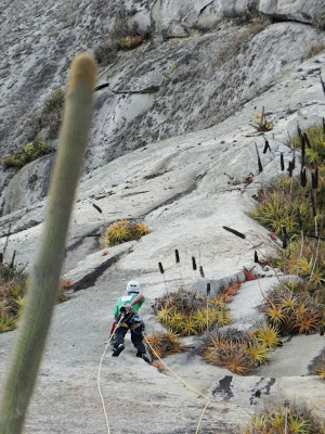 Continuamos escalando, o Marcelo guiou a segunda, u emendei a terceira com a quarta, já achando que estávamos livres e de repente, outro rasante! Esse foi mais emocionante porque eu tava em um trecho mais delicadinho da via, mas foi a mesma coisa, ela se afastou e sumiu. Mais algumas enfiadas com bonitos lances em agarras, aderência, cristais bem protuberantes, um trecho em A0 e cume!