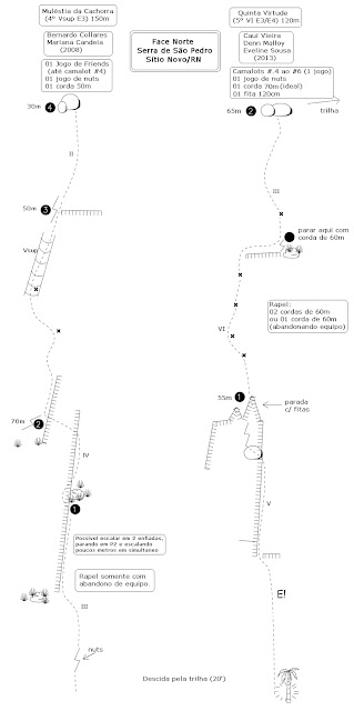 Acesso: Pra chegar na face norte basta subir a trilha que começa na face sul e leva ao cume, após algumas rampinhas, já quase no cume ela bifurca, entrando à esquerda logo se vê dois blocos grandes de pedra em cima do lajedo, aí é só passar por eles, descendo a rampa (aqui já se vê a face norte) e seguir a trilha pelo rio seco até alinhar-se com as vias (os diedros são visíveis de longe), depois é só seguir em direção à elas.