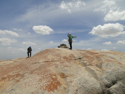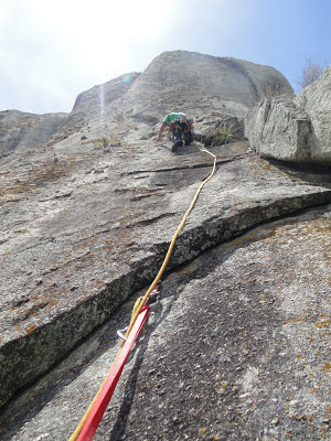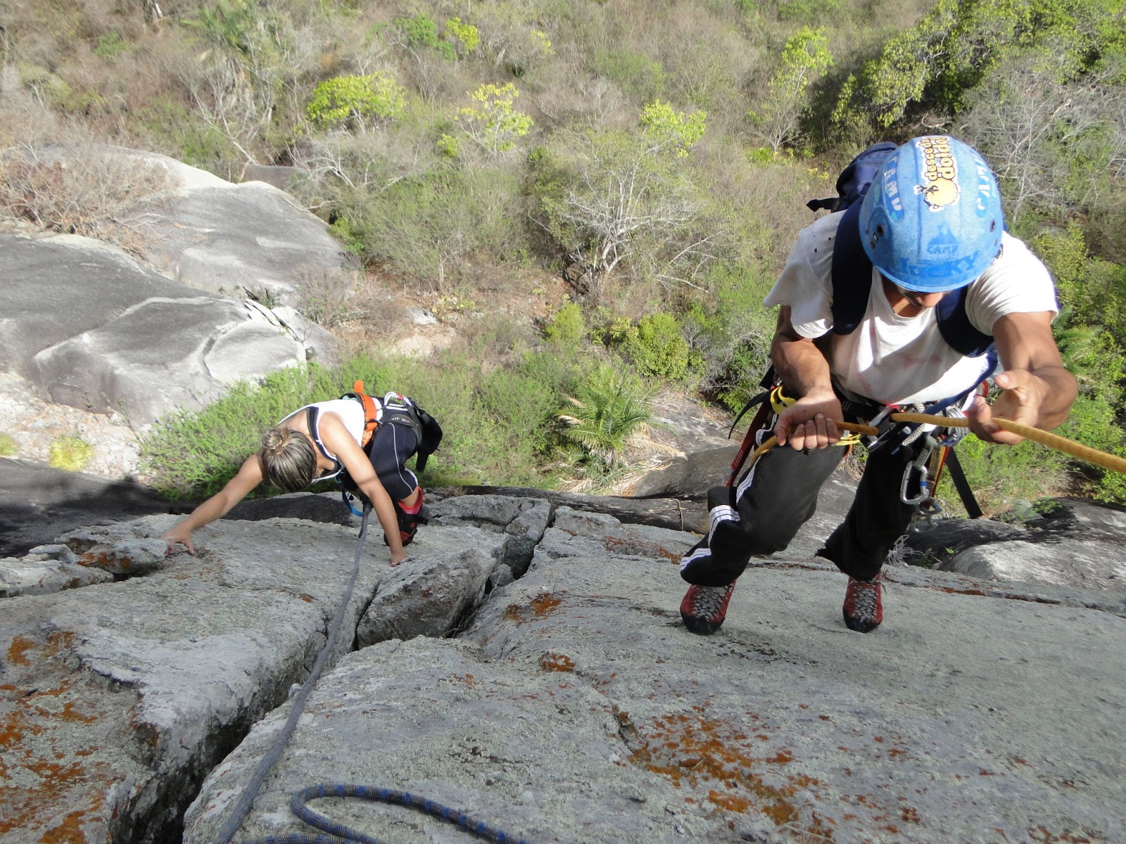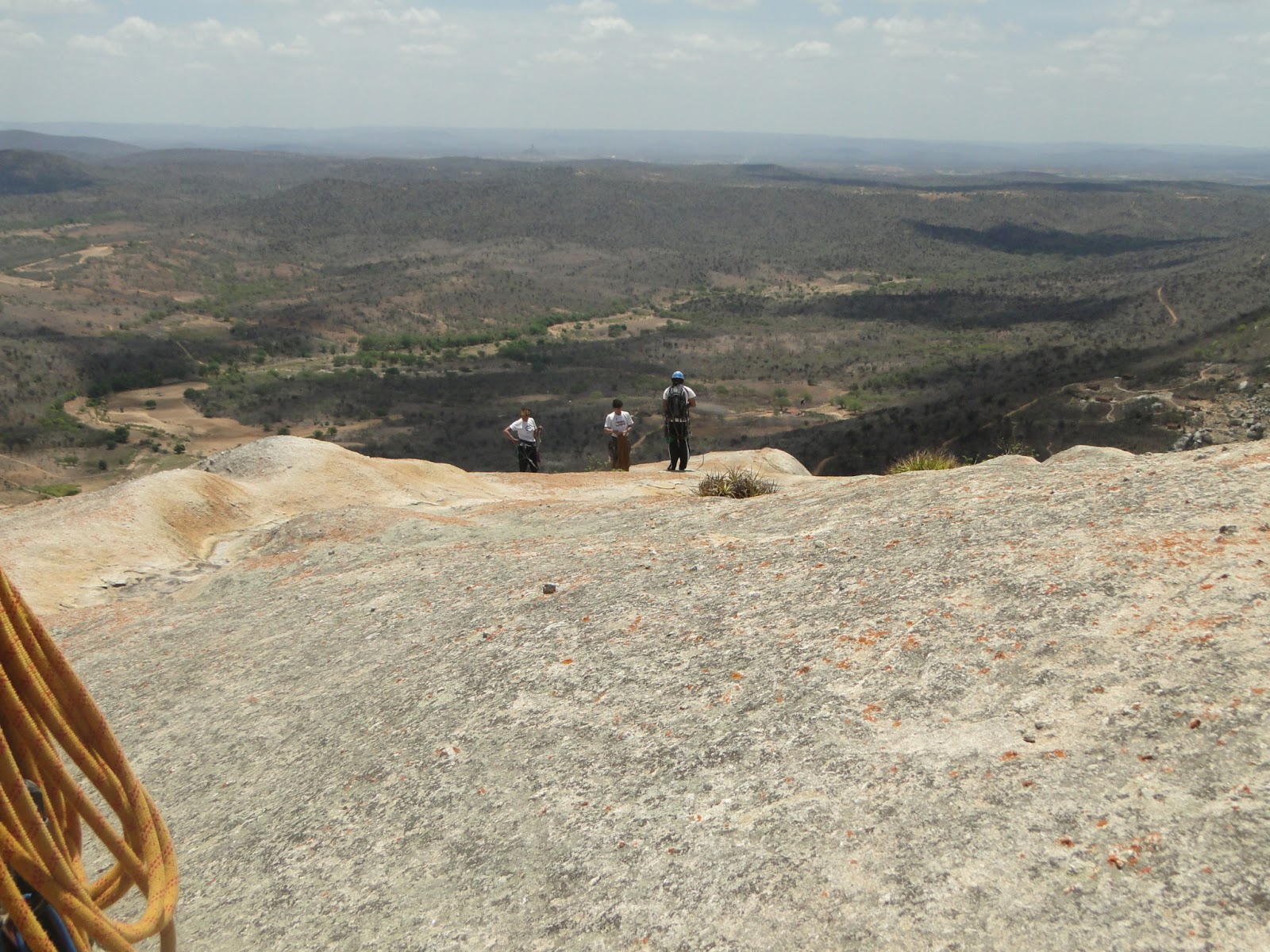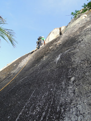 Achamos a base da via e começamos a escalar e logo o sol começou a pegar, Denn tocou a primeira enfiada já emendando com a segunda, totalizando quase 70m de escalada, sendo a primeira parte uma aderência/agarras tranquila mas sem possibilidade de proteger e depois um belo diedro até a P2. Fiquei com a segunda enfiada, que tem início no final do diedro, passando por dois grampos e entrando em uma canaleta bem delicada, protegida com duas peças pequenas. Segundo as infos deveria ter feito uma parada no final da canaleta, no único lugar possível, meio esquisitinho pois depois disso vem uma rampa até o cume, preferi esticar a corda de 70m e fui subindo até o cume, onde lacei os blocos de um antigo cruzeiro e puxei Denn e Eveline. Eles precisaram escalar um trecho em simultâneo pois pra chegar no cruzeiro são cerca de 80m, mas é bem tranquilo. Cume! Deu pra fazer os 150m em 2 enfiadas, acho que foi uma boa opção.