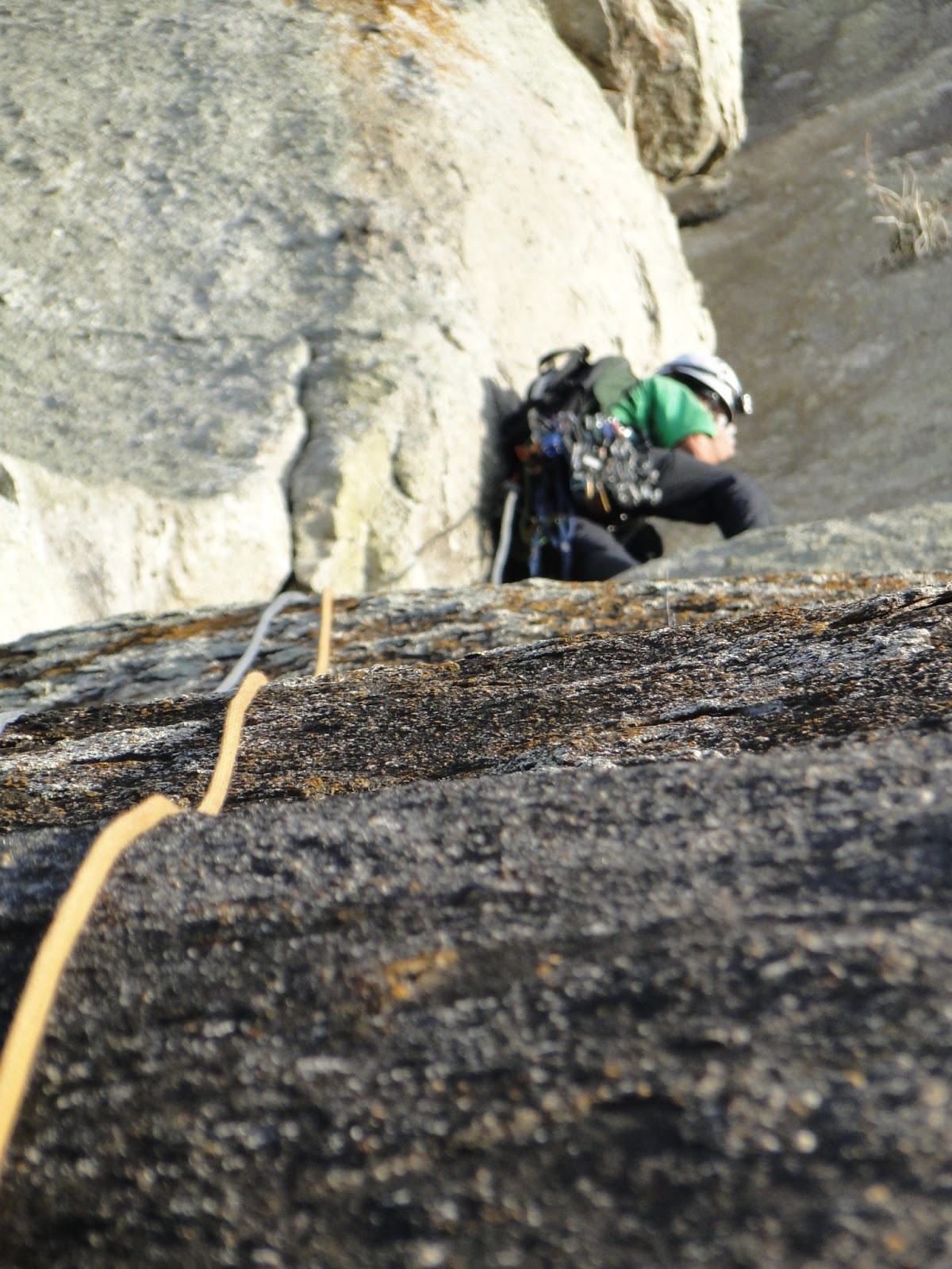 Rodrigo e Michele voltaram pra Serra e lá fomos nós pra conquistar uma nova linha ao lado da Muléstia das Cachorra! Mais cedo tinhamos observado uma linha bonita passando por um diedro gordo na primeira metade da parede e seguindo pela face até o cume. Sob o vôo da águia chilena começamos o trampo, o diedro começava láá no alto, então…toca-toca até chegar nele pra poder proteger, esse lance foi tenso, as agarras não são muito sólidas, melhor não cair. Chegando num platô no início do diedro dá pra colocar um camalot #2 bomba e começar a brincar com as peças grandes, o diedro é grandão, eu escalei hora diedrando hora entalando braço/ombro, talvez dê pra fazer de off width, usei o #6 e o #5 (esse no limite da abertura) e se tivesse algo maior usaria tb! kkkk Chegando mum bloco grande no diedro, antes de ter que passar pra direita, domina-se o diedro e vai por cima até um platô formado pela grande pedra encostada na parede que forma o diedro. Chegamos na P1! Duas fitas laçando os blocos/lacas são uma boa opção. Puxei o Denn e comecei a segunda enfiada, agora sem fendas e em um lance mais difícil, bati dois grampos e fixamos a corda para descer e voltar no dia seguinte, pra tentar passar ali com a luz do dia e poder sair por cima (já que deixamos as coisas na base).