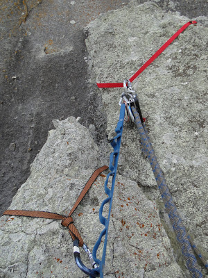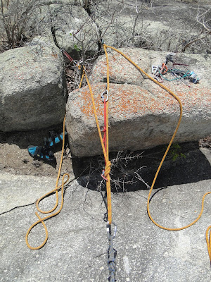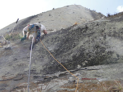 Domingo de manhã subimos a trilha, a corda fixa e continuamos a conquista, ainda tive que bater mais 2 grampos onde achei que daria pra passar sem, o lance era mais delicado do que imaginei e não cabia nada de móvel, mas ficou bacana! Depois mais uma pecinha, outro grampo alguns lances nos cristais extratégicamente posicionados, rampinha e cume! Essa enfiada ficou com uns 65m e termina em uns blocos no cume, exatamente alinhados com a via onde dá pra montar uma parada bem legal!