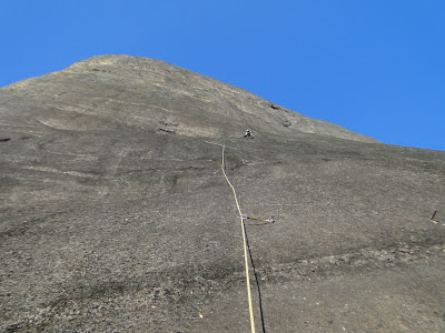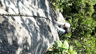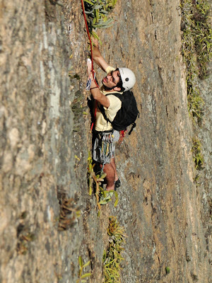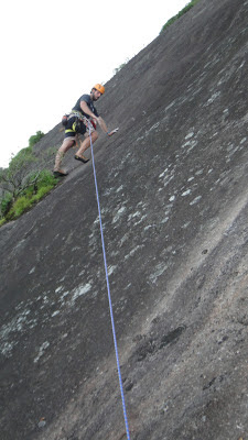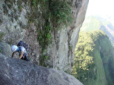 Na terça os trabalhos continuaram! O Márcio Formiga me levou pra conhecer as vias do pico Perdido do Andaraí, no Grajaú. O guia de escalada de lá é bem simples e, não sei se nós que não soubemos procurar, mas nem a extensão das vias tinha nos croquis =p. O resultado é que escalamos a CEB-60 (5° VI E2 465m) e a DGM (5° VI E2 405m) e só depois eu percebi que tinhamos subido mais de 800m em pouco mais de 7h, debaixo de um sol esperto!