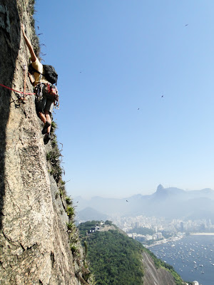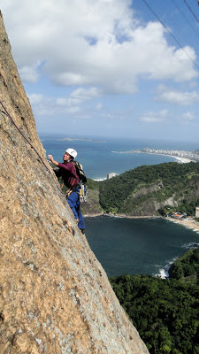Cheguei ao Rio no domingo que estava rolando a ATM (Abertura da Temporada de Montanhismo), infelizmente tarde demais para participar do campeonato, mas ainda em tempo de dar uma escaladinha no Pão de Açúcar! Após rever os amigos fui com o Arthur na Alfredão (6° VIIc E2 120m), via técnica que começa fácil e vai ficando gradativamente mais difícil e vertical, até o seu lance final, onde é o crux! Ainda descemos a tempo de assistir a final do masculino!