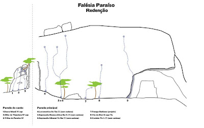 Ainda tinha um dia sobrando antes de voltar pra Recife, peguei uma carona com a galera pra conhecer o novo setor em Redenção/CE, distante 70km de Fortaleza, a Falésia Paraíso possui várias vias legais, de 3° até 8c e alguns projetos. Abaixo está o croqui da falésia principal, ainda tem mais umas vias e boulders espalhadas pelos blocos ao redor que não estão no croqui, o tempo foi curto então tentei escalar o máximo que pude!