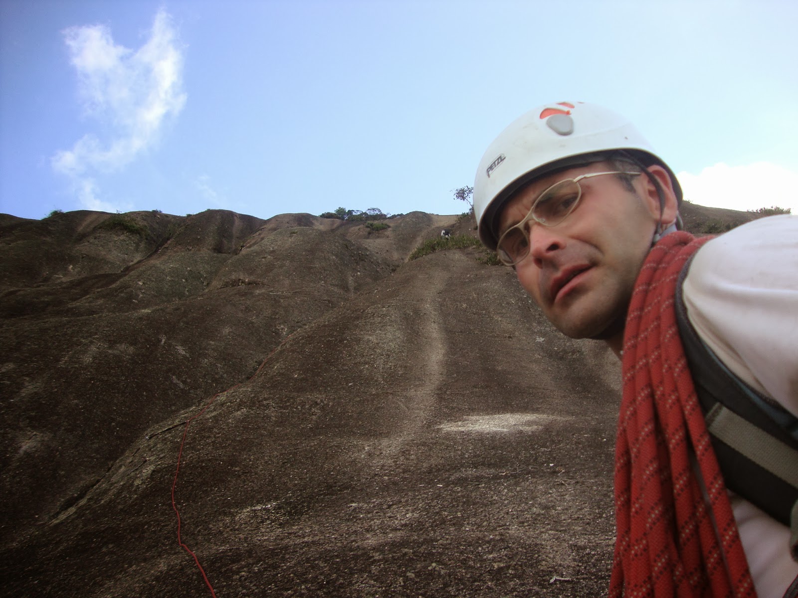 Otto já tocou mais três enfiadas na sequência, acho que um dos trechos mais psicos da via, com alguns esticões de VI grau em agarras quebradiças, felizmente a única que quebrou não o fez cair também!