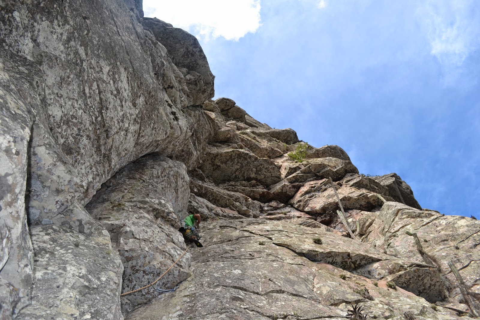 Saindo um pouco pra esquerda, virando a esquina e tocando reto, próximo à aresta, com proteções razoáveis na horizontal, se pode escalar por rocha limpa até o cume. Assim fizemos da primeira vez. Agora fui mais pela direita, me embrenhando no mato onde era aparentemente mais fácil, mas a corda pesa bastante e tem uns lances chatinhos, melhor ir pela direita mesmo…P5 em alguma arvore do cume e pronto!