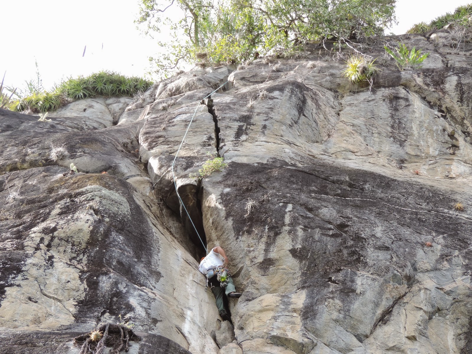 Ainda sobrava mais uma fenda pra subir: a Jiboia (VI) começa segurando nuns blocos entalados, faz o crux meio pela fenda, meio por fora e depois segue pela bonita fenda que vai ficando cada vez mais fácil até o final. Depois ainda entrei na “Dor de ouvido”, uma via fixa que tem ao lado, boas agarras passando por um tetinho bem legal pra finalizar a escalada nesse setor.