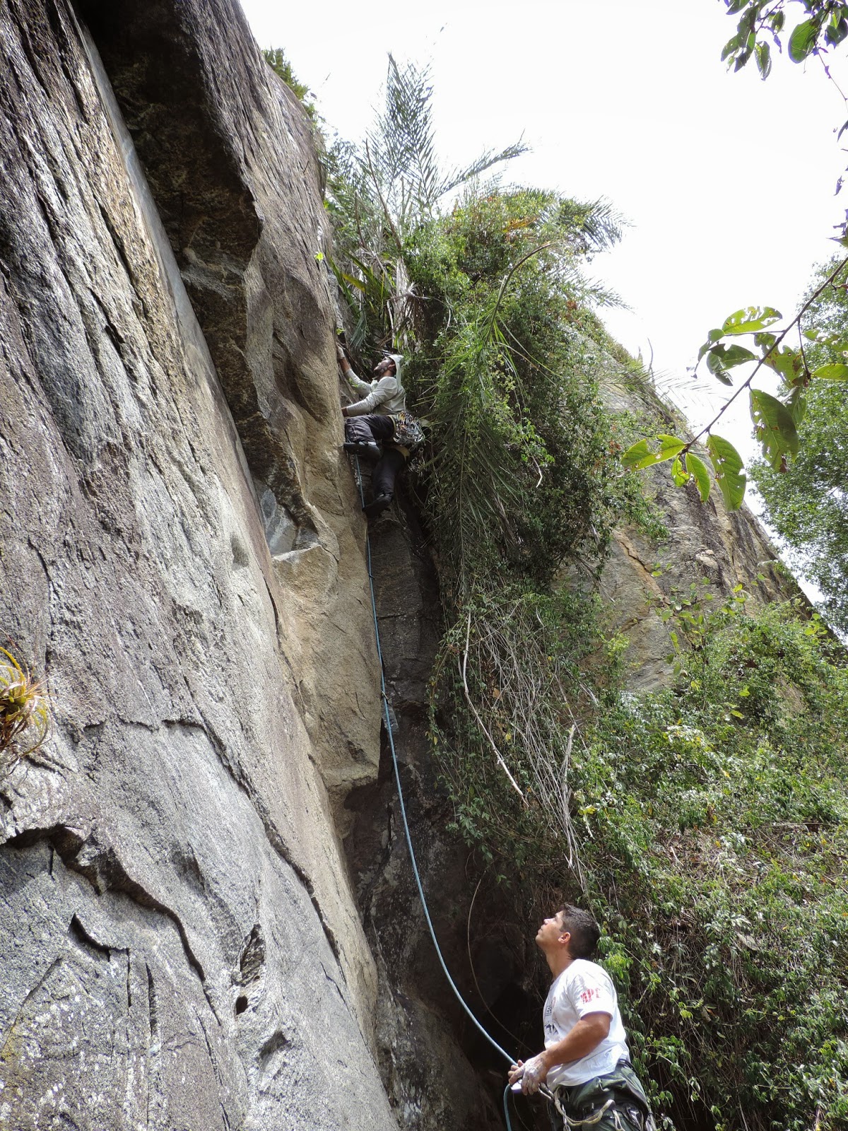 Seguimos pro setor das esportivas, onde tem duas vias de 7a, talvez b, fixas. A primeira não tem nome, começa com dois friends nos buracos e segue protegida por chapas numas lacas bem delicadas, num negativo leve, depois vai ficando positiva e mais tranquila a escalada. A via estava terminando em uma chapa com malha-rápida num platô antes do cume, segundo Wolgrand, chegando lá olhei pra cima e vi mais uma chapa distante, fui lá…quando cheguei a chapa tava à “meia rosca”, e não dava pra apertar com a mão, dei uma insistida no lance, mas era meio estranho, com umas lacas toscas, apesar de parecer ser a virada pro cume já, desci dali mesmo, em uma delicada operação…kkkk
