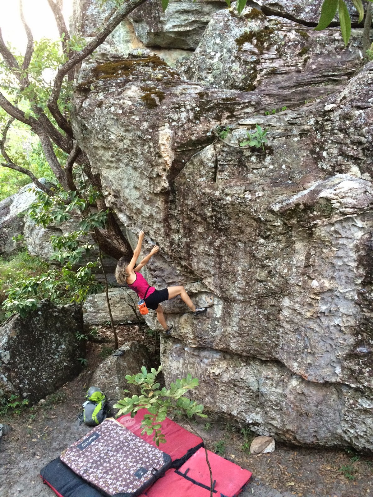 Terceiro dia, de volta aos boulders, mais espanco, claro, só que dessa vez rolaram algumas cadenas pra aumentar a moral! Começamos pelo setor do Mocó, e Eveline pela Fendinha SDS (V1), depois Invertidinha (V1), e eu tomei um couro do invertidão, V6 de um movimento.