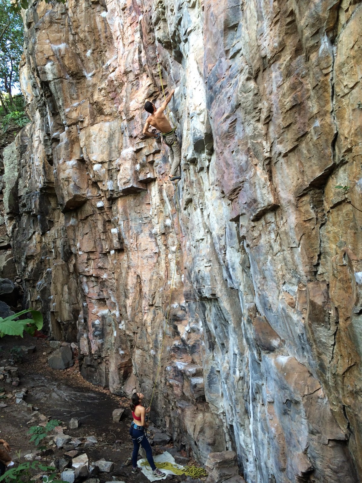 No segundo dia fomos com o Vitor e a Lud pro Morro do Macaco, uma falésia de quartzito incrível, com muitas vias, de todos os graus. Esse dia foi mais amigável pra nós, entrei na Língua de Fora, caí no início, mas fui até o crux da segunda parte pra ver, depois entrei novamente, consegui fazer a primeira parte sem cair e entrei no crux do 9b(?), caí, mas deu pra ver que apesar de duro, não é impossível, quem sabe na próxima…
