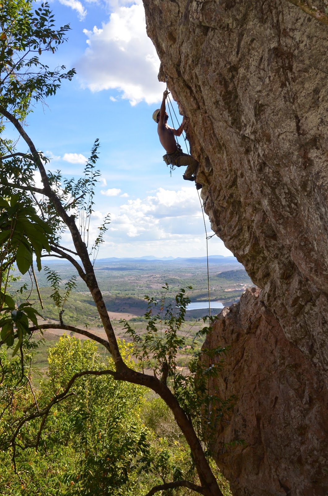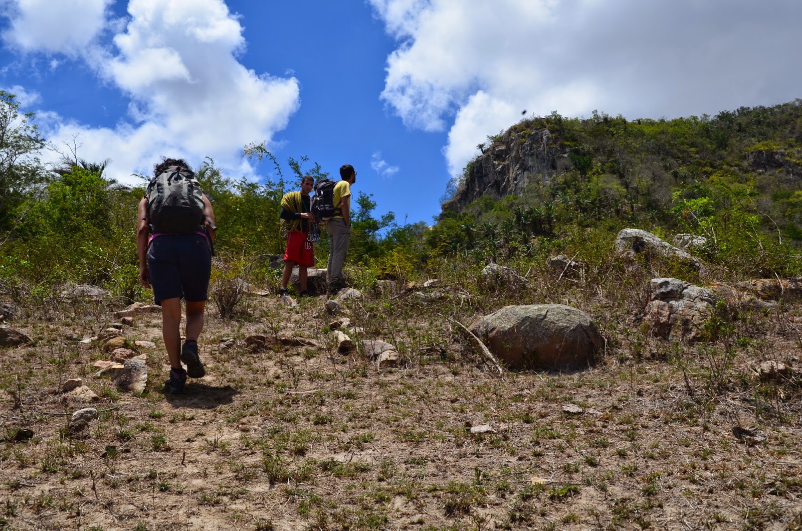Depois de uma subidinha curta, mas intensa sob o sol do meio dia, chegamos na base da pedra, onde as árvores são grandes e dá pra curtir uma sombrinha. Entramos primeiro na “Eu pensei que era homem” (VI), um vertical que lembra a escalada no Morro da Fonte, em Itatim/BA.