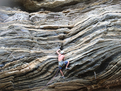 Conhecemos, nos dois dias que ficamos lá, as vias esportivas, que são negativas em sua maioria, com agarras macias. A falésia tem pelo menos 50 metros de altura, mas infelizmente a partir dos 15 a 20m em média a qualidade da rocha torna meio inviável a escalada, mas até lá dá pra bombar os braços já! Aos poucos estão sendo descobertas linhas que ganham mais altura, como até 40 metros.