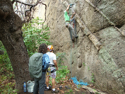 Comecei na frente e dei de cara logo no início com, adivinha o que?! Mato, é claro! um matinho aqui outro ali, uma chapinha pra pisar aqui outra ali, umas cordas fixas que já pareciam parte do meio ambiente, dois rebites, e cheguei na P1. A segunda foi do Otto, felizmente. Alguns lances delicados na face, depois uma chaminé curta, totalmente lisa e bem molhadinha, não sei como ele passou ali, mas foi. Eu toquei a terceira, diagonal pra direita, depois nadar no mar de mato até a P3. A quarta enfiada tem um bonito diedro, mas não era minha vez… fiquei com as duas últimas, incluindo um tetinho bacana em A1.