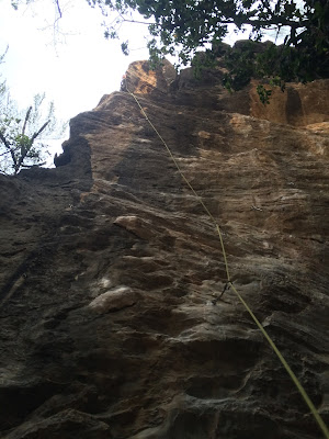 Ali perto entramos em uma via linda chamada Michelangelo (6c) uma saída boulderística, em seguida lances técnicos e depois agarras boas até o fim, recomendo.
