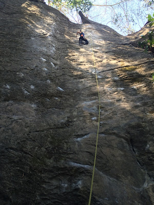 Depois gastei um tempo fritando na Inquilino (9a), entrei com os betas do Beli, passei a primeira parte, mas fritei no crux e caí, depois foram mais duas entradas meio toscas, caindo no mesmo lugar até que finalmente refinei um pouco os movimentos e fiz mais força, passando o crux e chegando ao final.