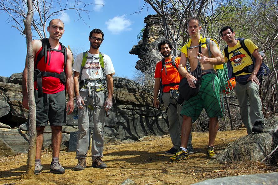 Voltamos pra Fortaleza só o bagaço, acho que foram 6 dias seguidos de escalada, e ainda faltou subir a Cabeça do Índio, observe a pedra atrás do povo na foto abaixo: