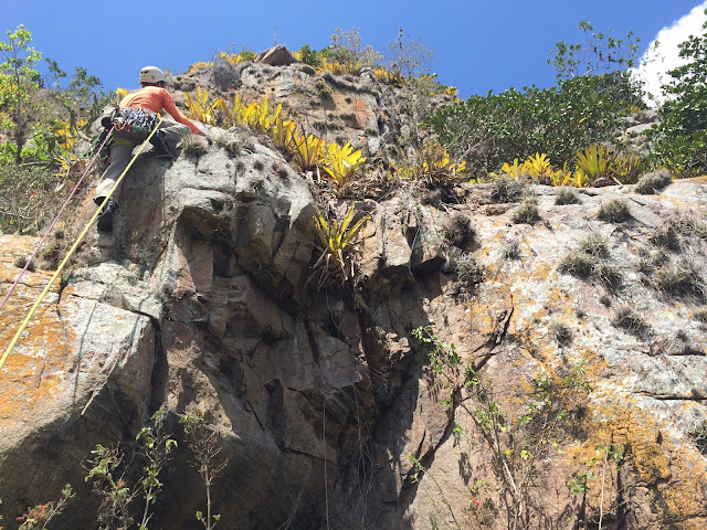 Saindo bem pra esquerda, segue por uma canaleta de mato com alguns grampos, depois não vi mais nada até chegar no cume, passando por uma aderência bem positiva, puxei os dois sentado no cume e fomos em busca do rapel.