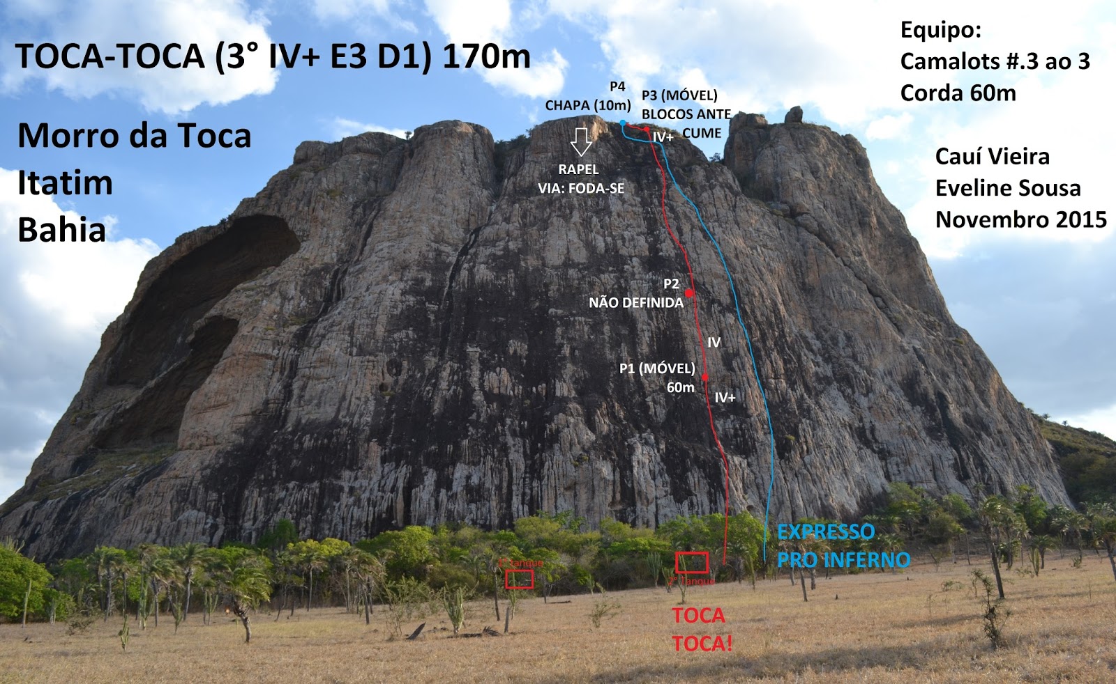 Tínhamos mais um dia e resolvemos escalar um pouco no Morro da Toca, e de tarde subir uma via maior, optamos pela Expresso pro Inferno, até então uma das últimas vias conquistadas na Toca, pelo Ary, Fabiano e Marlon, de Natal/RN.