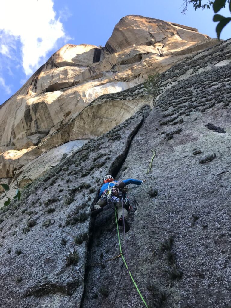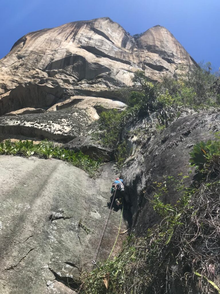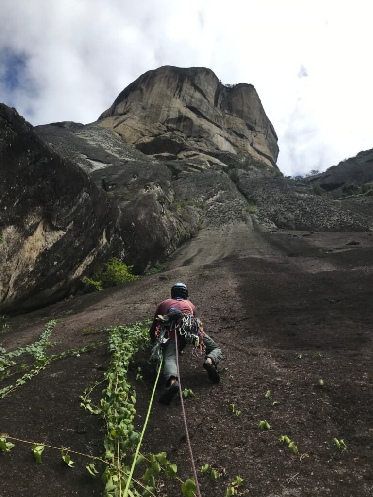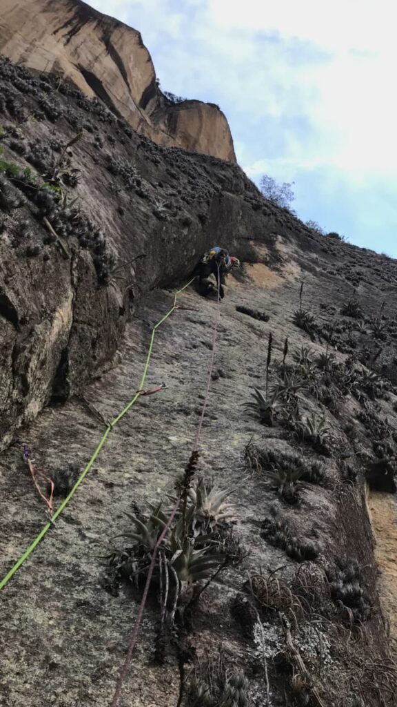 Domingo saímos às 6h30, já com luz do sol pra ajudar na navegação, sem mochilas, só pra abrir a trilha. Foram 2h até a base da via, onde descansamos um pouco e voltamos pra pegar os haulbags. Agora com a trilha aberta, foram cerca de 40min de subida apenas!