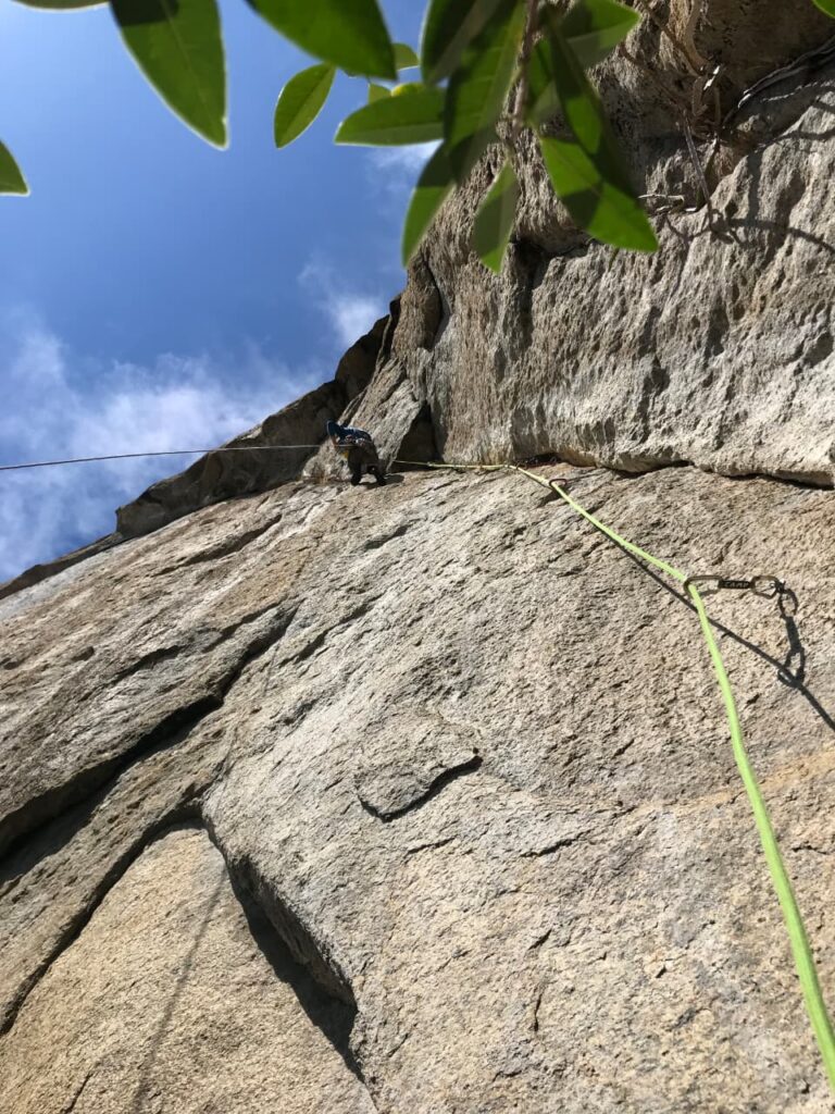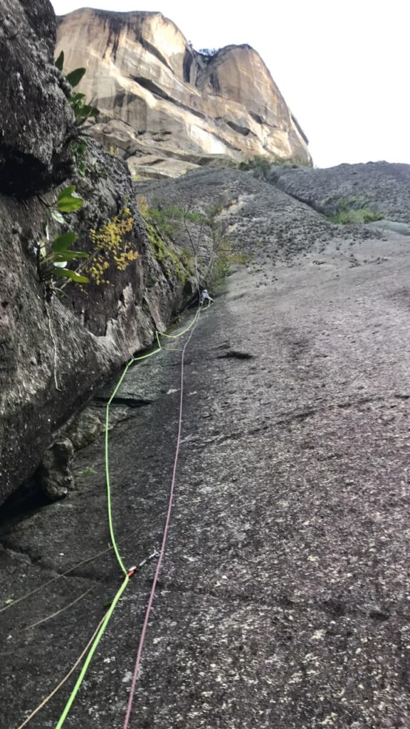 Decidimos acordar tranquilos e experimentar a próxima enfiada, um lindo diedro que nos custou um tempo razoável pra fazer até a chapa da metade, ajudando a aceitar a ideia de que não daria tempo de concluir a via. Ainda arrisquei subir de top rope em livre pra limpar, e realmente o negócio começa a ficar bonito ali! Tão bonito quanto difícil! A cor da parede muda, a vegetação some e pelo relato dos conquistadores, ali começa a parte interessante. Rapelamos de lá, e lá está mais uma pendência…